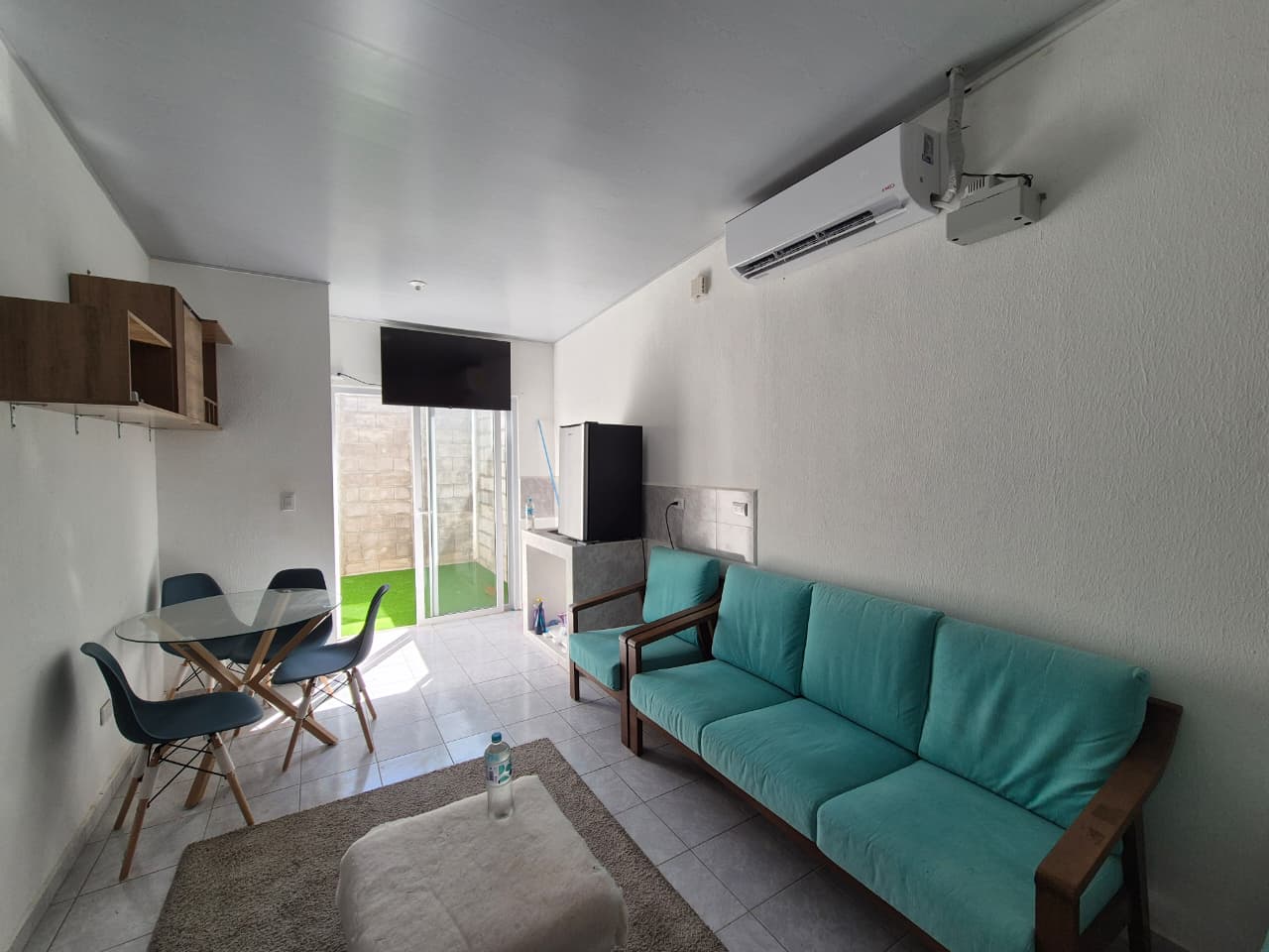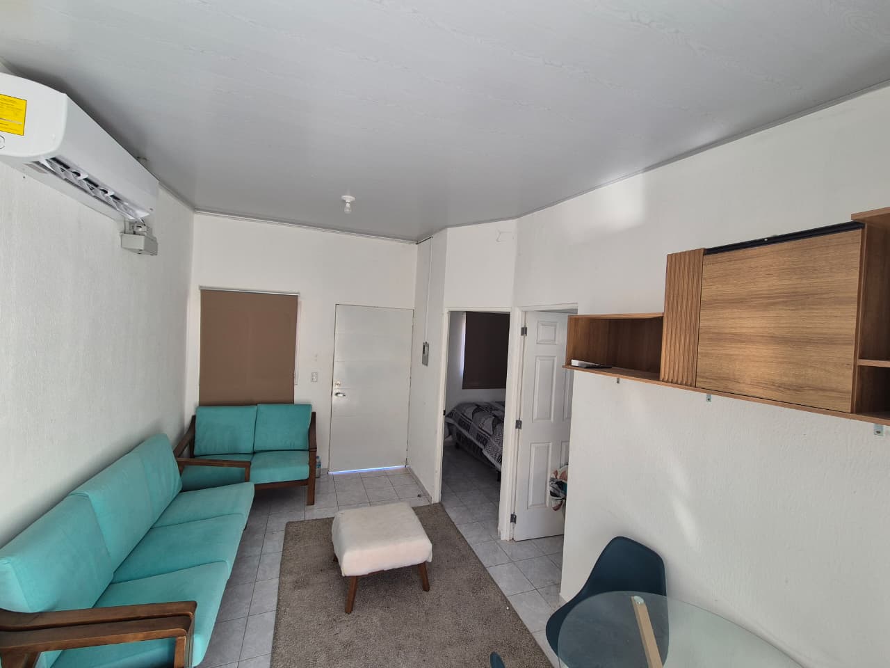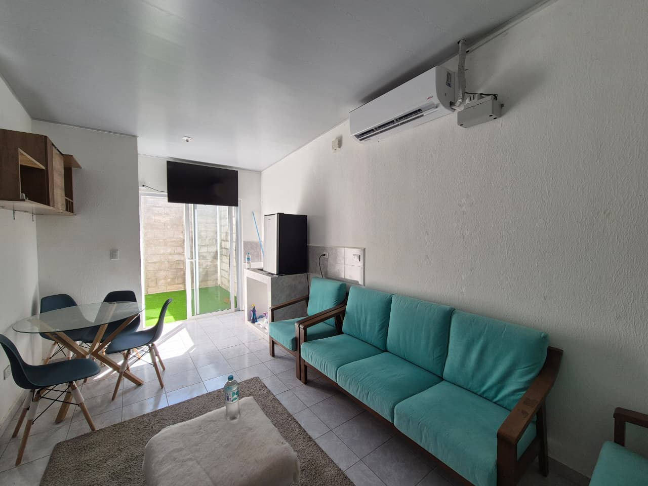 🛋️ Sala con aire acondicionado, mesa, muebles, cortinas y televisor