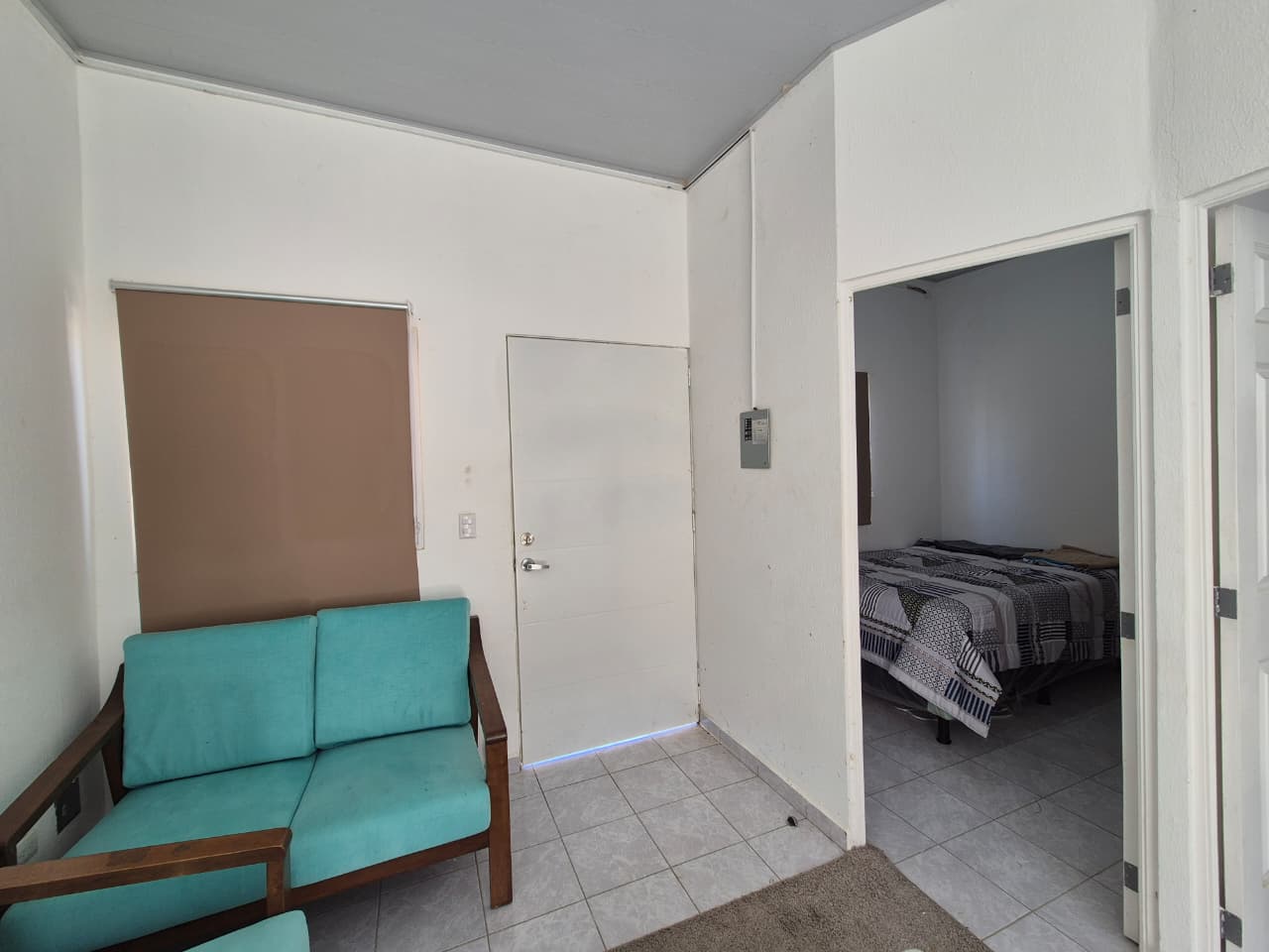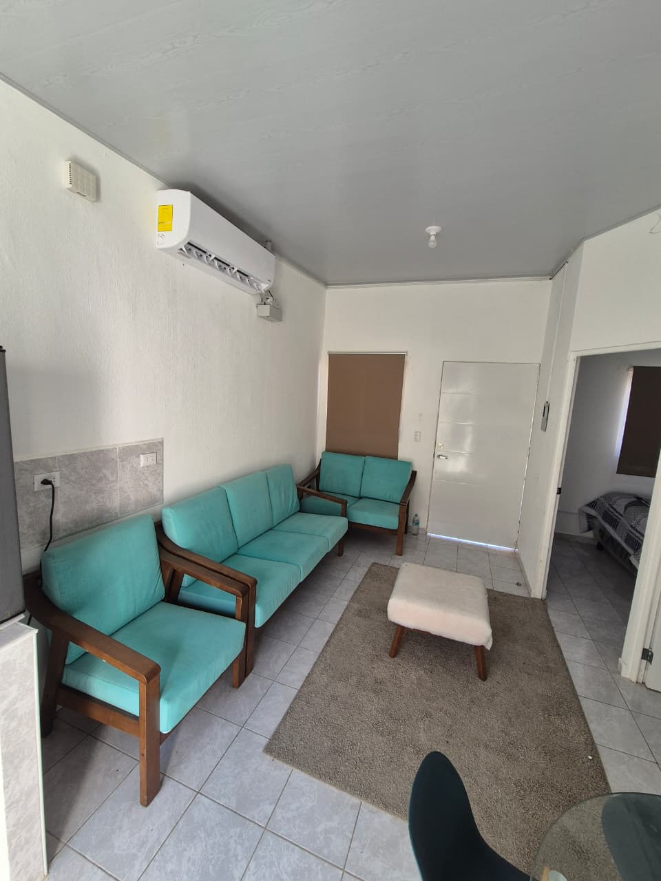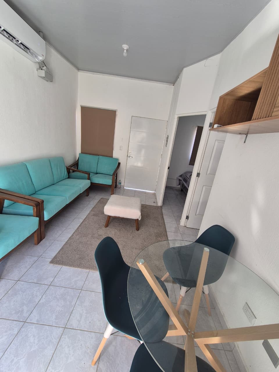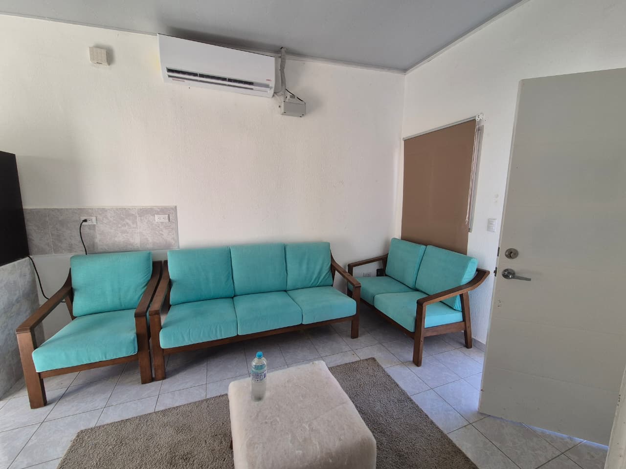 🛋️ Sala con aire acondicionado, mesa, muebles, cortinas y televisor